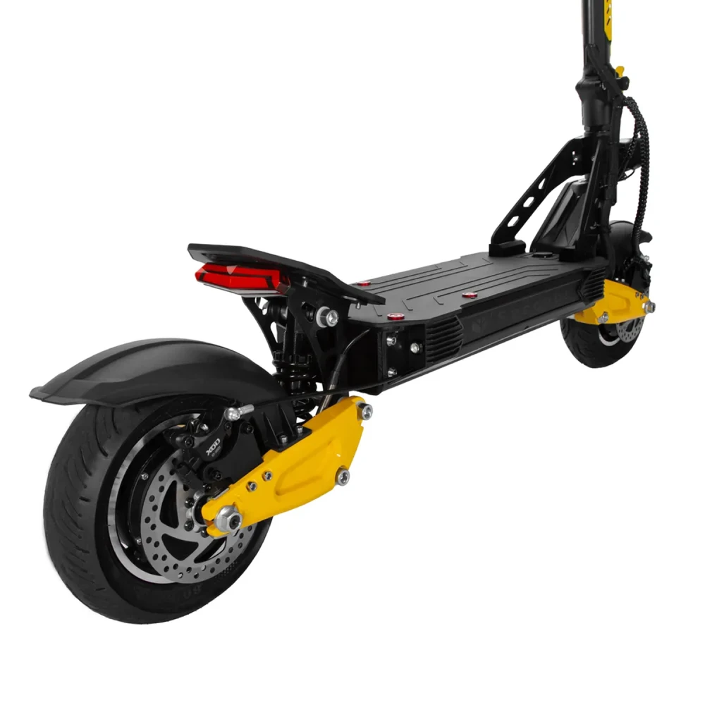 Яркие желтые элементы на черном корпусе не только создают запоминающийся стиль, но и повышают заметность в потоке транспорта. Продуманная система освещения включает фронтальную фару, стоп-сигналы и боковую подсветку, что делает поездки в темное время суток более безопасными и комфортными.