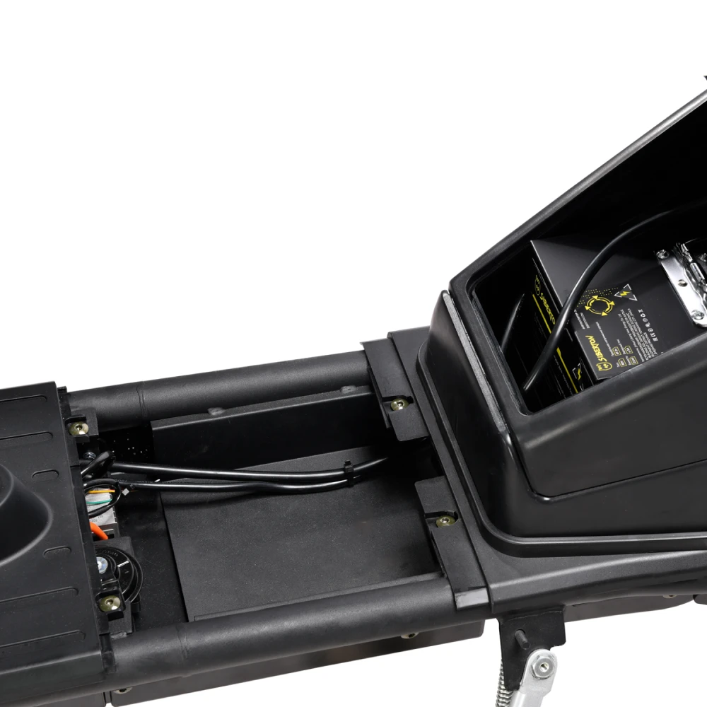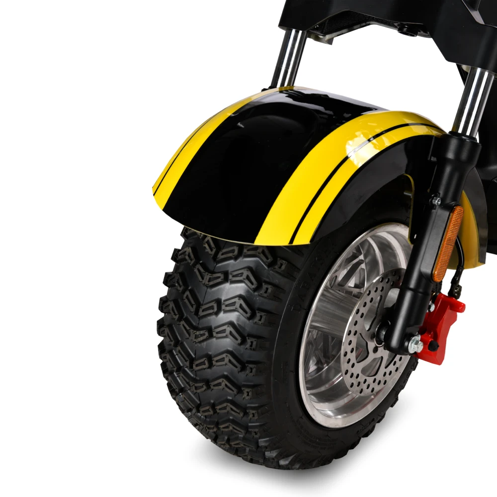 Мощность мотора 2000 Вт (номинал) обеспечивает разгон до 45 км/ч и подъемов до 20–25° даже при полной нагрузке 260 кг, но на неровностях или в дождь скорость падает. Аккумулятор Li-ion 60V дает заявленный пробег 60 км в идеале (Eco-режим, ровный асфальт), балансируют скорость/запас хода, снижая потребление на 20–30% в Eco. Тормоза — гидравлические дисковые (диаметр 120–140 мм), эффективны на мокром асфальте; энергоэффективность высока благодаря рекуперации (5–10% возврата энергии); зарядка (7 часов) стандартна для Li-ion без потери срока службы.