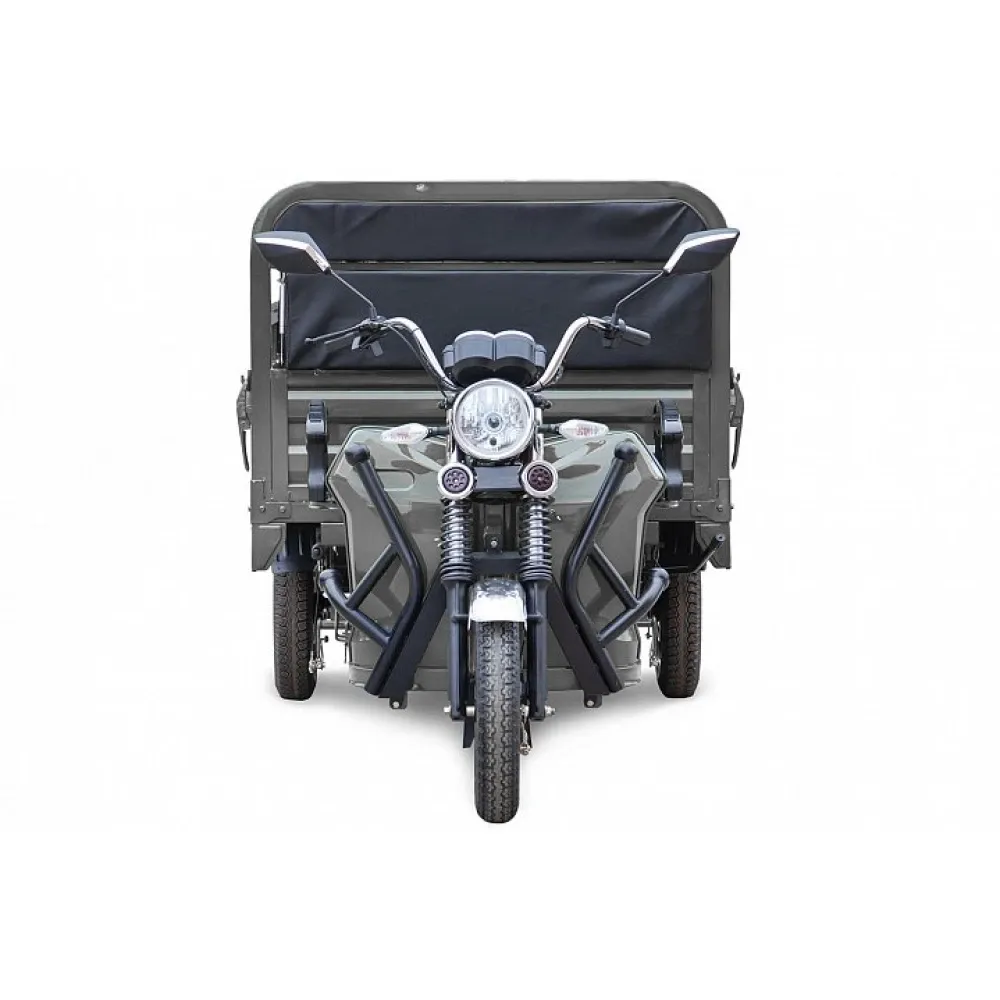 Элетротрицикл рассчитан на водителя с пассажиром, оснащен мягким сиденьем, повторяющим анатомические части тела, снимающую усталость при длительной дороге. Вместительный кузов представлен размерами 1800 x 1250 x 475 мм (Д х Ш х В), имеет откидные борты, что удобно для сельских жителей, транспортирующих сено с полей.