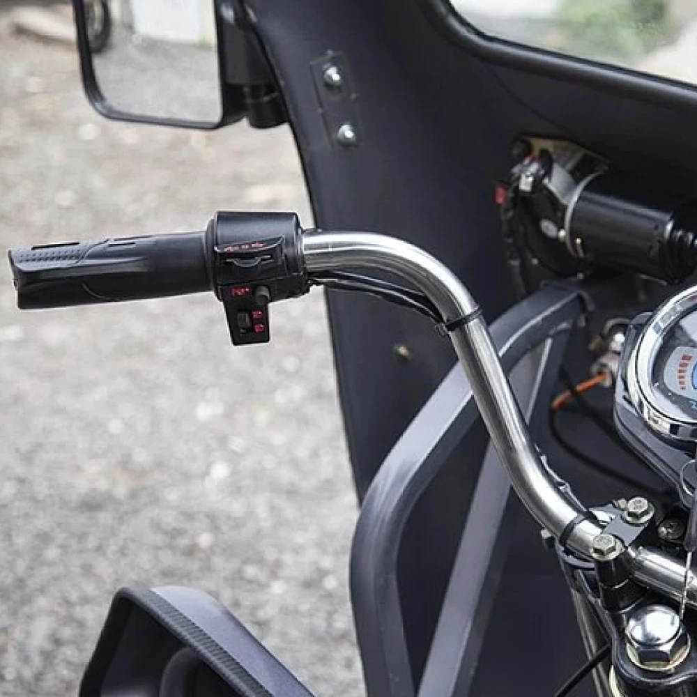Несомненным достоинством модели является закрытая кабина и наличие прочной крыши. Подобная особенность позволяет использовать технику при любых погодных явлениях. Утолщенное лобовое стекло надежно защищает от ветра. Свободное прохождение препятствий на дороге возможно благодаря усиленным передним и задним амортизаторам.