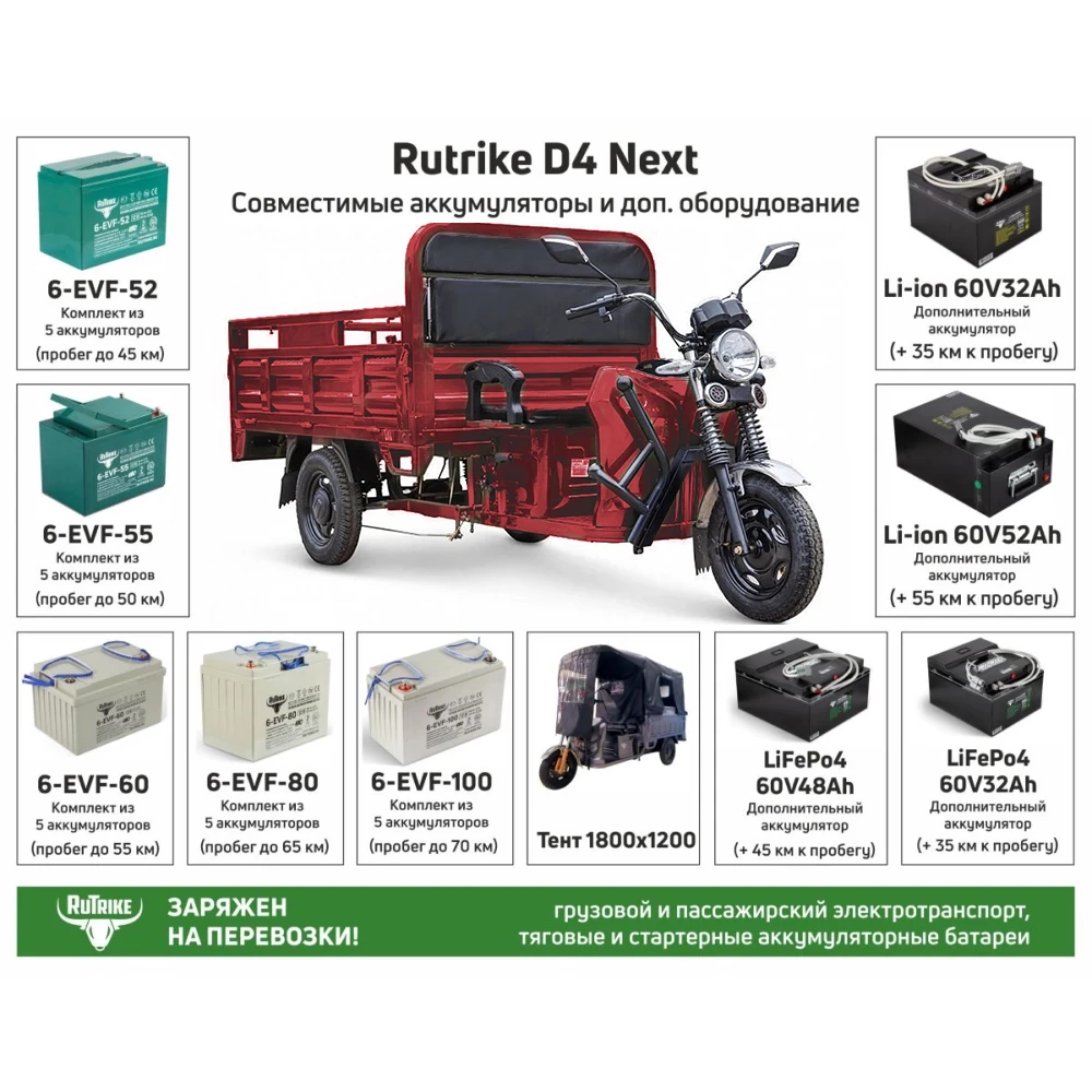 Грузовой электротрицикл Rutrike D4 NEXT 1800 60V1200W в красном исполнении - это выразительное и функциональное решение для грузоперевозок. Этот электротрицикл не только привлекает внимание своим ярким дизайном, но и обеспечивает высокую производительность благодаря мощному двигателю мощностью 1200 Ватт.С весом всего 240 кг, Rutrike D4 NEXT 1800 60V1200W способен перевозить грузы весом до 1200 кг, что делает его незаменимым помощником в грузоперевозках. Максимальная скорость 25 км/ч позволяет быстро и безопасно перемещаться по городу, минуя пробки и заторы.Одним из ключевых преимуществ этого электротрицикла является его аккумулятор Li-ion ёмкостью 60V, который обеспечивает пробег до 80 км на одном заряде. Время зарядки аккумулятора составляет всего 5-8 часов, что делает его удобным и практичным в использовании.Приобретая Rutrike D4 NEXT 1800 60V1200W у официального дилера, вы получаете гарантию качества и надежность продукта. Этот электротрицикл - идеальное решение для тех, кто ценит эффективность, надежность и стиль.