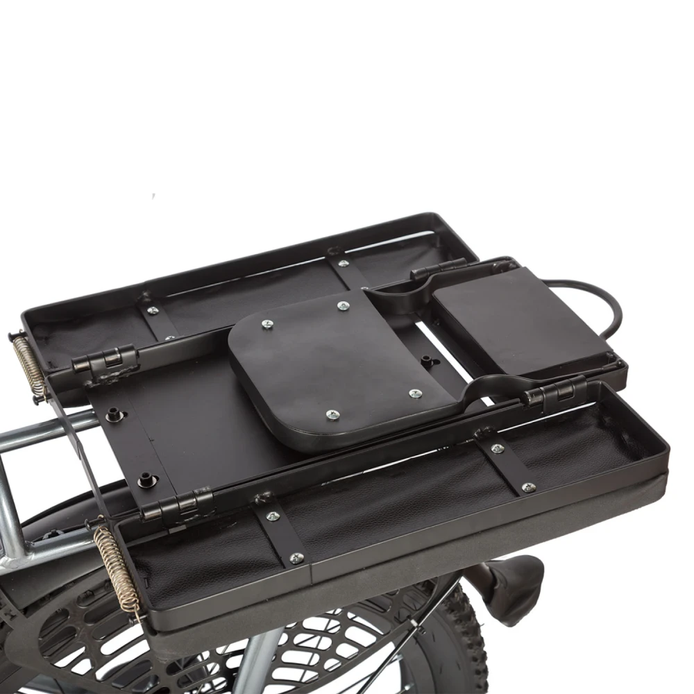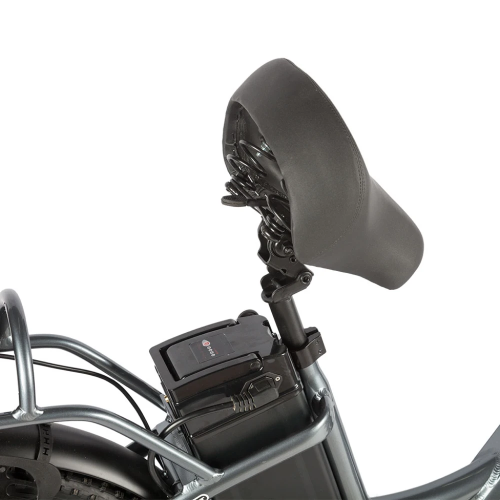 Два сиденья и вместительная корзина позволяют кататься вдвоём или брать с собой всё, что нужно для работы, отдыха или покупок. Быстросъёмный аккумулятор удобно расположен под сиденьем — зарядка станет ещё проще и мобильнее. Тебя выделят современные фишки: яркая фара, задний фонарь со стоп-сигналом и поворотниками, металлические крылья с брызговиками и ручка газа для полного контроля над скоростью.
