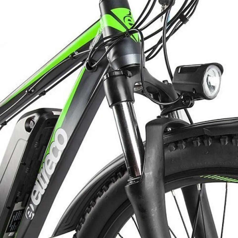 Колеса на Eltreco XT 850 new по размеру 27,5 дюйма. Такой диаметр колеса обеспечивает комфортное движение даже при неровностях и препятствиях. На переднем колесе установлен эксцентрик, поэтому его легко снять с вилки для удобства транспортировки. Имеется амортизирующая подвеска.