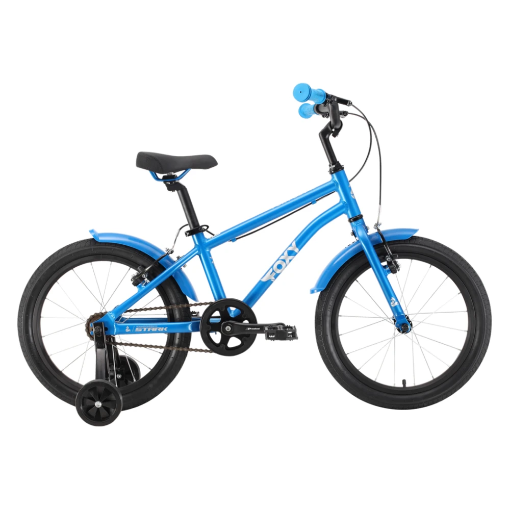 Велосипед Stark'22 Foxy Boy 18 голубой/серебристый также оснащен двумя детскими колесиками, которые обеспечивают стабильность и помогают мальчикам освоить навыки велосипедной езды.
